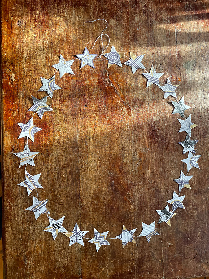 Aus alten „Vorschau-Heften“ bastelte sie aus den ausgeschnittenen Blättern und mit Faden verbunden einen Weihnachtskalender mit 24 Sternen. Jeder Stern wurde zudem noch liebevoll bemalt und mit grafischen Strukturen versehen.