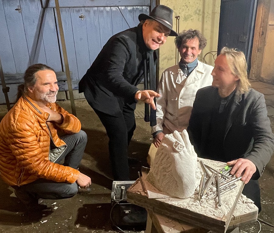 Das Glück nach getaner Kunst: Pianist Martin Fischer, Schauspieler Tom Quaas, Steinbildhauermeister Marcus Faust und Gastgeber Karl-Friedrich Aust. Hinter der Kamera die versammelte Begeisterung aus Radebeul und Umgebung.