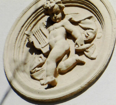 Das Material besteht in der Regel aus einer Mixtur aus Lehm, Gips oder auch Zement. Diese Rezeptur, die im fertigen Zustand (dazu gehört auch ein Brennprozeß) möglichst witterungsbeständig sein sollte, war ein Betriebsgeheimnis. Die in Radebeul gefundenen Figuren haben sich über die 150 Jahre auch recht gut gehalten, es gibt kaum Brüche oder Auswaschungen. Allerdings hat die Taktstraße der 60- und 70-er Jahre sicher auch in dieser Gruppe von Stuckerzeugnissen zu Verlusten geführt als die sozialistischen Reparaturbrigaden rasche Erfolge vorweisen und sich nicht mit „Klein-klein“ aufhalten wollten. Mit den noch vorhandenen Medaillons sollten wir heute bei Haussanierungen auf jeden Fall sorgsamer umgehen, im Falle eines Kulturdenkmals sowieso. Außer den kleinen Medaillons (Durchmesser ca. reichlich 50cm) aus Stuck gehören noch die verzierten, runden Lüftungsöffnungen – sh. V&R 04/ 22 – und die „Bilder in dreieckigen Rahmen“ – sh. V&R 08/24. Die vorgestellten Medaillons wurden üblicherweise auf der Schauseite der Häuser, manchmal auch an den Flanken zu den Nachbarn angebracht; man wollte zeigen, dass man Sinn für alles Schöne hat! Farblich sollten diese Medaillons nur eine Nuance heller gehalten sein als die Putzflächen, z.B. Weiß vor Hellocker. In einem Fall (kein Denkmal) wurde der Kontrast voll ausgereizt, weißes Medaillon vor roter Putzfarbe. In anderen Fällen konnten Medaillons den Farbton eines hellen Sandsteins haben, waren aber kein Sandstein.