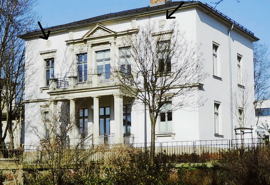 Das Material besteht in der Regel aus einer Mixtur aus Lehm, Gips oder auch Zement. Diese Rezeptur, die im fertigen Zustand (dazu gehört auch ein Brennprozeß) möglichst witterungsbeständig sein sollte, war ein Betriebsgeheimnis. Die in Radebeul gefundenen Figuren haben sich über die 150 Jahre auch recht gut gehalten, es gibt kaum Brüche oder Auswaschungen. Allerdings hat die Taktstraße der 60- und 70-er Jahre sicher auch in dieser Gruppe von Stuckerzeugnissen zu Verlusten geführt als die sozialistischen Reparaturbrigaden rasche Erfolge vorweisen und sich nicht mit „Klein-klein“ aufhalten wollten. Mit den noch vorhandenen Medaillons sollten wir heute bei Haussanierungen auf jeden Fall sorgsamer umgehen, im Falle eines Kulturdenkmals sowieso. Außer den kleinen Medaillons (Durchmesser ca. reichlich 50cm) aus Stuck gehören noch die verzierten, runden Lüftungsöffnungen – sh. V&R 04/ 22 – und die „Bilder in dreieckigen Rahmen“ – sh. V&R 08/24. Die vorgestellten Medaillons wurden üblicherweise auf der Schauseite der Häuser, manchmal auch an den Flanken zu den Nachbarn angebracht; man wollte zeigen, dass man Sinn für alles Schöne hat! Farblich sollten diese Medaillons nur eine Nuance heller gehalten sein als die Putzflächen, z.B. Weiß vor Hellocker. In einem Fall (kein Denkmal) wurde der Kontrast voll ausgereizt, weißes Medaillon vor roter Putzfarbe. In anderen Fällen konnten Medaillons den Farbton eines hellen Sandsteins haben, waren aber kein Sandstein.