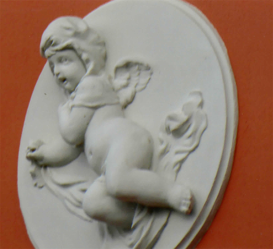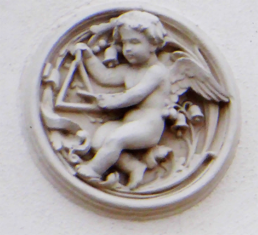 das Eigenheim bereichern sollten. Wenn das dem Bauherrn gefiel und für ihn der Aufpreis zu stemmen war, dann bekam er die zwei Medaillons mit geflügelten Musikanten. Sozusagen ein Sahnehäubchen für das schlichte Landhaus. Aber das war kein „Muß“, denn nicht an jedem Haus dieser Zeit finden wir Medaillons. Manchmal waren sie aber bereits Bestandteil des Projektes, wenn der Architekt sonst eine gestalterische Lücke an der Fassade hätte hinnehmen müssen. Bei den Medaillons handelte es sich meist um Katalogware einer kleinen Manufaktur (wie die Firma Lehmann in Kötzschenbroda), von den Radebeuler Beispielen dürfte keins als Einzelstück von einem Stuckateur vor Ort geschaffen worden sein. Es spricht auch für Katalogware, weil man in Radebeul das gleiche Motiv wie den Engel mit Triangel und Glöckchen mehrmals finden kann. Was für Motive habe ich außer dem Triangelspieler in Radebeul noch für leicht bekleidete, geflügelte Wesen angetroffen?