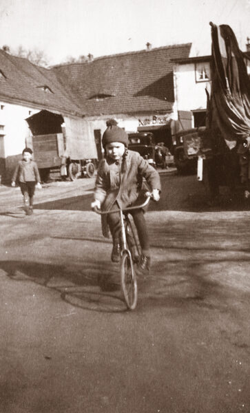 Hin und wieder kamen Heyls Kinder Inge, Erika und Rosi mit ihren Puppenwagen angefahren und wir fuhren gemeinsam auf dem Hof umher. Wie ich mich noch besinnen kann, hatte Inge auch schon einen Sportwagen, Erika hatte ein weißes gängiges Kinderwagenmodell und Klein-Rosi schob eine altertümliche hochrädrige Karre vor sich her. Wir waren glückliche, zufriedene und auch friedfertige Kinder, behütet von verständnisvollen Eltern und Großeltern sowie von allen lieben Verwandten. Inges Lieblingstante war Tante Elly, meine die Tante Rosel. Es war immer wieder ein freudiges Ereignis, wenn die Tanten aus Dresden kamen. Allerdings hatten wir Stiller-Kinder leider keine Großväter, beide waren frühzeitig verstorben. Wir hätten aber gerne wenigstens einen Großvater gehabt und so ernannten wir Vater Damme vom Mühlweg, einen lieben Stammgast, zu unserem Großvater.