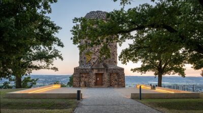 Außenanlagen Bismarckturm: Der 1907 errichtete Bismarckturm ist ein Radebeuler Wahrzeichen, das mit dem Einbau der Treppe 2015-2018 und den damit gestiegenen Besucherzahlen große Bedeutung erfuhr. Dem wurde jedoch das Umfeld nicht gerecht, was die Stadt nunmehr ändern ließ. Hangseitig wurden bereits vor wenigen Jahren Natursteinmauern und Sitzgelegenheiten geschaffen. Nun wurde die 14 Meter im Quadrat messende Fläche im Norden angegangen. Besucher freuen sich an einem Granitpflasterweg und einer wassergebundenen Wegedecke mit Einfassungen aus Sandstein, die zum Niedersetzen einladen. In die Sockel sind LED-Bänder integriert, die zum Abend hin Licht-Akzente setzen. Die Einfassung wird am Hauptzugang durchbrochen und ein zweites Mal auf der Westseite für einen behindertengerechten Abgang zu den unteren Aussichtsebenen. Das bestehende Baumviereck wurde an einer Stelle ergänzt und rahmt nunmehr das neue Parterre ein. Zwei bequeme Treppen führen auf die unteren Ebenen. Dort laden neue, an die Hangform angepasste Rundbänke zum Verweilen und Schauen in die umgebenden Weinhänge ein. Bei der Bepflanzung mit heimischen Gehölzen und Büschen hat die Coswiger Landschaftsarchitektin Dorothea Knibbe auch an Insekten und Kleintiere gedacht.